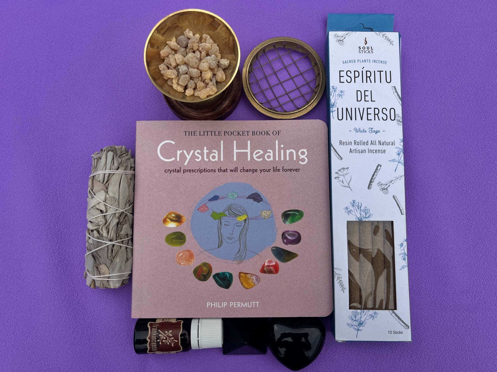 Spiritual Cleansing Kit: Sage, Crystal Healing Book, Artisan Incense, & Healing Stones